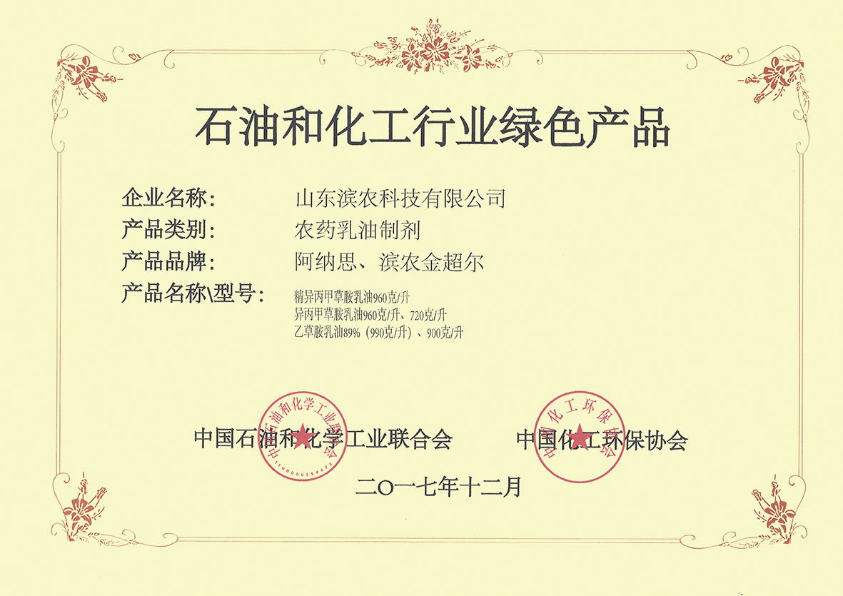12月14日,由中國石油和化學(xué)工業(yè)聯(lián)合會和中國化工環(huán)保協(xié)會主辦的“2017年石油和化工行業(yè)綠色發(fā)展大會”在北京隆重召開,山東濱農(nóng)科技有限公司農(nóng)藥乳油制劑 “960 克/升精異丙甲草胺乳油”“960 克/升、720 克/升異丙甲草胺乳油”“89%(990 克/升)、900 克/升乙草胺乳油”等產(chǎn)品被認(rèn)定為“石油和化工行業(yè)綠色產(chǎn)品”并獲頒證書。