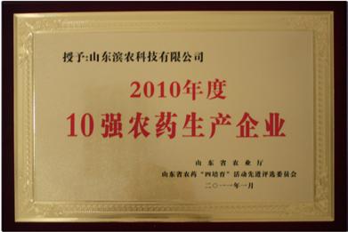 1 月 21 日,山東省農(nóng)藥檢定所召開了 2011 年山東省農(nóng)藥管理工作會議,會上我公司被評為 2010 年山東省農(nóng)藥“四培育”活動 10 強農(nóng)藥生產(chǎn)企業(yè)第一名。