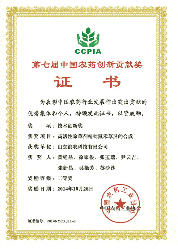 我公司“高活性除草劑精吡氟禾草靈的合成”項目 獲“第七屆中國農(nóng)藥創(chuàng)新貢獻獎”發(fā)布時間:2014-11-29 16:0510月28日,我公司“高活性除草劑精吡氟禾草靈的合成”項目被中國農(nóng)藥工業(yè)協(xié)會授予“第七屆中國農(nóng)藥創(chuàng)新貢獻獎——技術(shù)創(chuàng)新二等獎”。 精吡氟禾草靈是我公司采用獨創(chuàng)的合成工藝自主研發(fā)的手性農(nóng)藥,其去除了近40%的無效異構(gòu)體,使原材料較吡氟禾草靈節(jié)省近40%,每畝用量折合原藥僅 5-7克,同量防效為吡氟禾草靈的近2倍,符合節(jié)能減排的國家政策及我國農(nóng)藥向高效、低殘留、環(huán)境友好型方向發(fā)展的趨向。該產(chǎn)品適用于大豆、棉花、甜菜、油菜、馬鈴薯、花生、西瓜等多種闊葉作物防除一年生和多年生禾本科雜草。