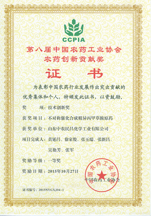 第八屆中國農藥創新貢獻獎盛典頒獎 我公司獨創新項目獲技術創新一等獎發布時間:2015-11-02 11:2010月27-30日, 第八屆中國農藥創新貢獻獎獲獎結果在第十五屆全國農藥交流會主題大會上揭曉,山東中農民昌化學工業有限公司研究的“不對稱催化合成精異丙甲草胺原藥”項目被授予“技術創新獎”一等獎。 精異丙甲草胺是新型酰胺類除草劑,目前為全球最大的選擇性除草劑品種,可用于大豆、玉米、花生30多種作物田間大多數禾本科及闊葉雜草的有效防除,具有廣譜、高效、適用作物廣、用量低、安全性好的顯著優勢。我公司采用獨創的不對稱催化合成工藝制成精異丙甲草胺原藥技術填補了國內空白,成果達國際先進水平。