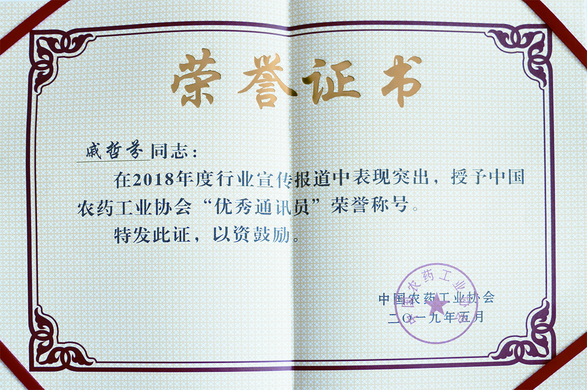 我公司戚哲芬榮獲中國農藥工業協會“優秀通訊員”榮譽稱號