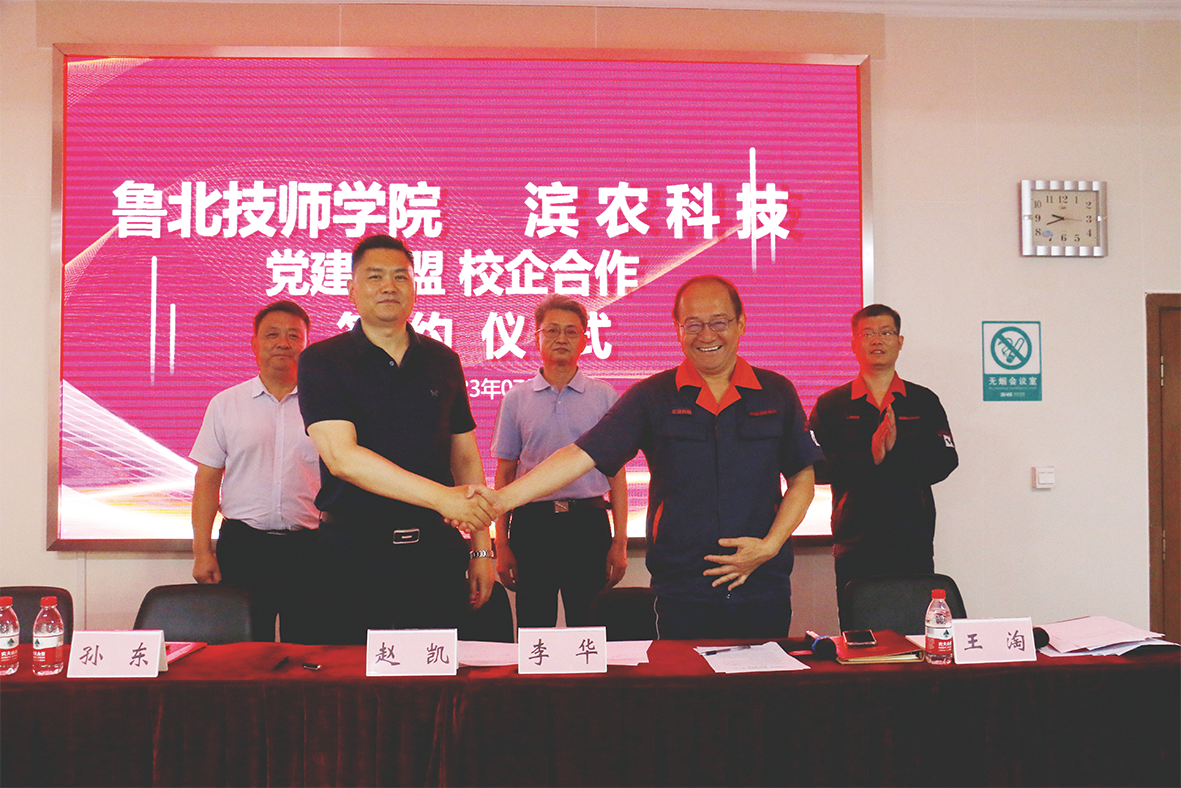 7月18日上午,魯北技師學院-濱農科技“黨建聯盟”企校合作簽約儀式在我公司四樓會議室舉行。魯北技師學院黨委副書記趙凱、繼續教育學院院長孫東、化工系主任崔洪波,我公司董事長李華出席簽約儀式,儀式由我公司人力資源部主任王淘主持。