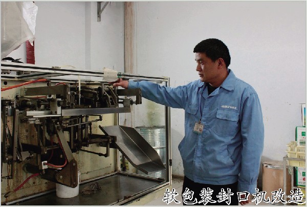 軟包裝車間粉劑水平包裝機由于機械磨損,容易導致頂封封口偏斜,需手動敲擊頂封托架調整,易損壞托架又影響工作效率,且調試中產生廢品多。今年在停機檢修時,設備班長楊訓提議在頂封托架下方焊接帶絲空的鐵塊,通過螺栓調整封口偏斜,經試驗取得良好效果,既方便又快捷,大大提高了效率。目前軟包裝車間已有5臺水平包裝機改制運行,此方法已得到設備技術部驗收; 近日,車間又在乳油車間安裝了一臺風機,并在每臺設備上加設引風管道,每個管道上加一蝶閥,控制風量大小,緩解了車間氣味,極大地改善了車間生產環境。