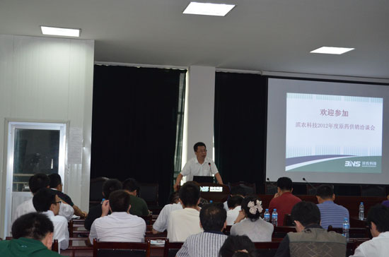 會議由采購部經理王銀鋒主持,副總經理閆勇致歡迎詞,就國內外原藥近幾年的現狀及未來發展趨勢做了詳細分析,并指出了今后原藥市場發展的方向。原藥部經理孫朝星為來賓詳細介紹了濱農的發展歷程,近幾年國內外市場齊頭并進蓬勃發展的現狀。供應商代表京博農化科技股份有限公司總經理戴榮華、采購商代表山東三農生物科技有限公司董事長吳文廷結合與濱農多年的合作情況,做了典型發言。
