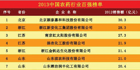 10月16日,在第十三屆全國農藥交流會主題大會上,中國農藥工業協會正式公布2013年中國農藥行業百強榜單,我公司以21.0億元的銷售額位列第六。