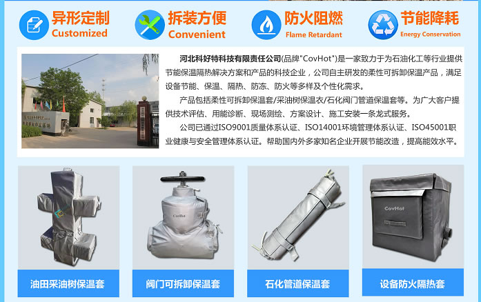 據了解,科好特公司的品牌"CovHot",是一家致力于為石油化工等行業提供節能保溫隔熱解決方案和產品的科技企業,科好特自主研發銷售的柔性可拆卸保溫產品,滿足設備節能、保溫、隔熱、防凍、防火等多樣及個性化需求。