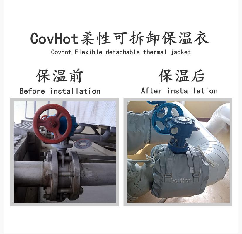針對(duì)以上保溫問題,科好特科技COVHOT經(jīng)過不斷的努力,自主研發(fā)的柔性可拆卸式保溫套產(chǎn)品采用多種新型材料復(fù)合制成,在產(chǎn)品投入使用前,我們都會(huì)對(duì)材料選擇、外形設(shè)計(jì)、安裝方式、搭接方式進(jìn)行全方位考究。