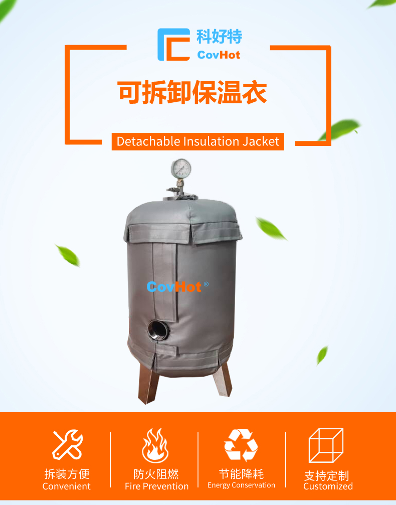柔性可拆卸保溫套根據(jù)熱力設(shè)備外形尺寸量身定制,與設(shè)備緊密貼合,整潔美觀,保溫材料導熱系數(shù)低,安裝拆卸方便。